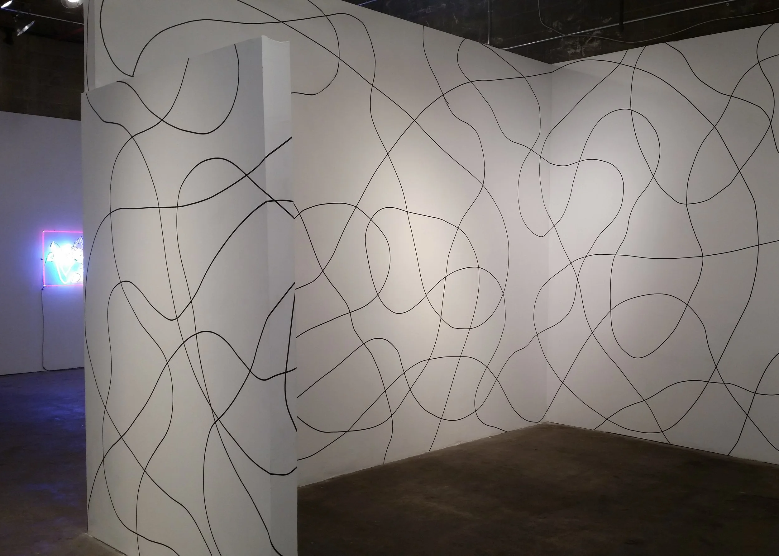 One continuous line masking tape drawing, black, white & red Brooklyn map, onto floor and walls, 2700 ft long