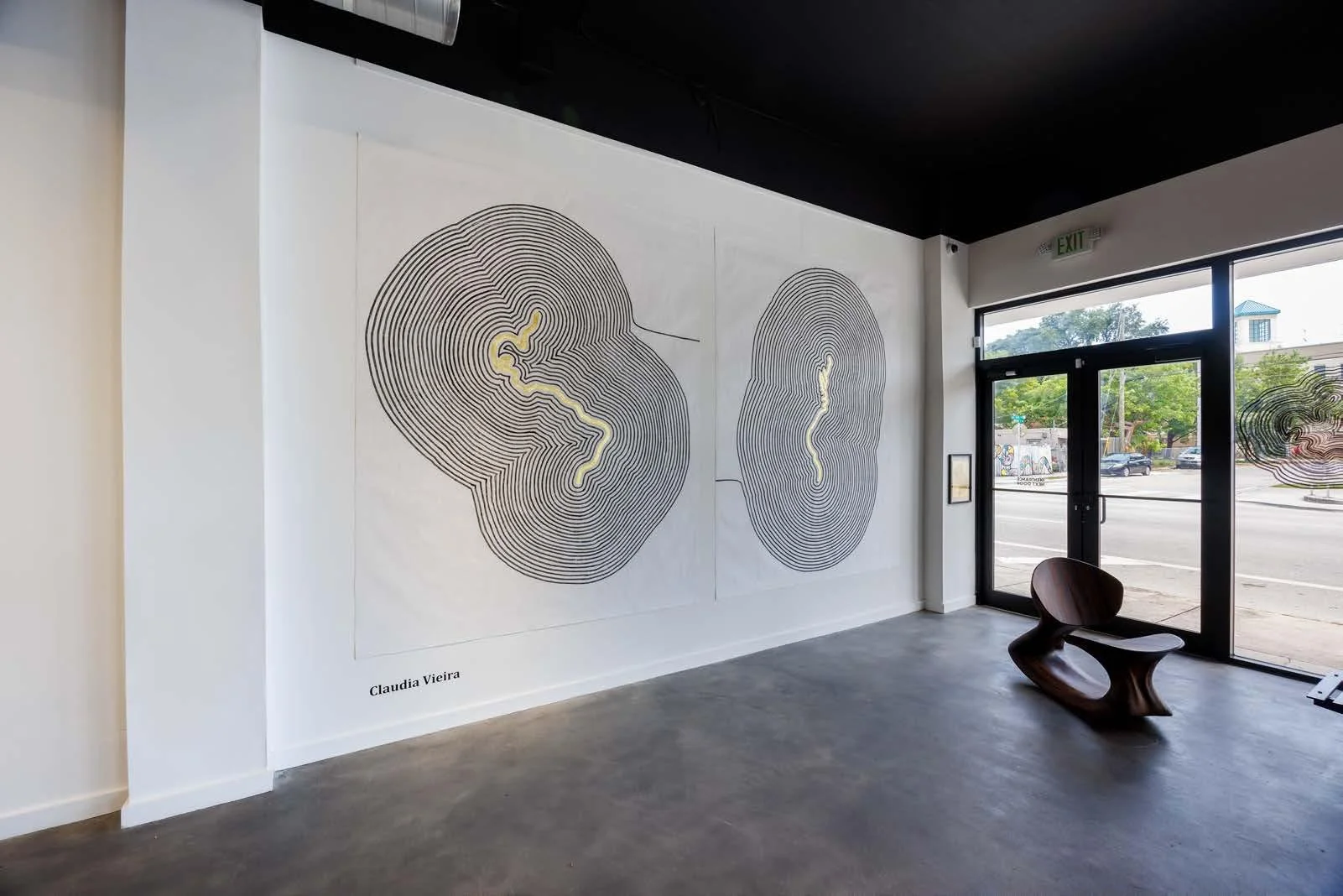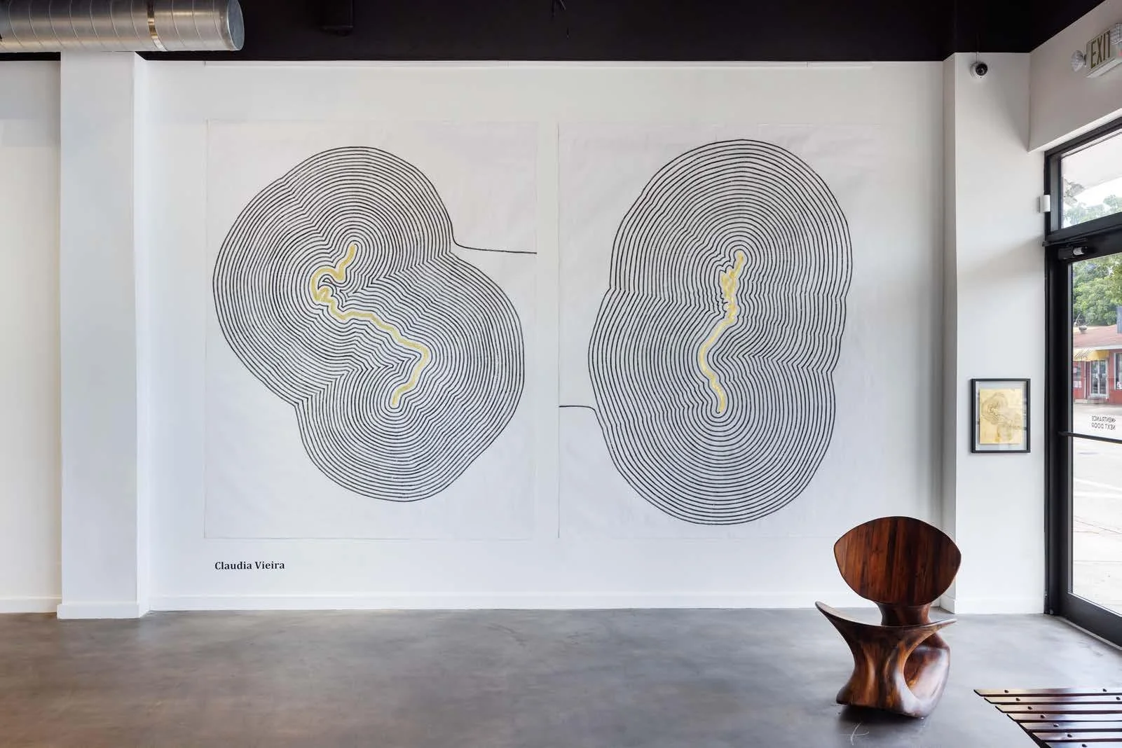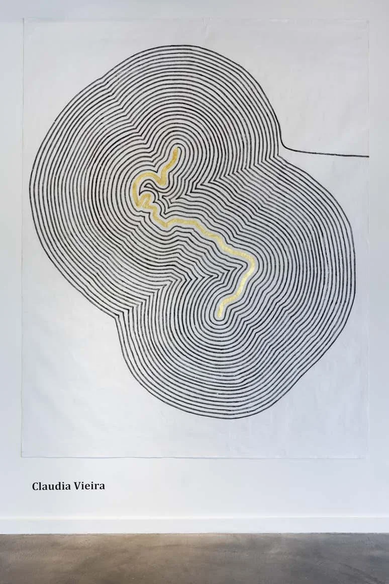 The diptych is composed by two drawings, on the left is a mapping from Porto Alegre where the artist was born to NY, where she lived during the opening she realized the line extended it self clockwise 27 times, coincidently the same number of years she lived in New York. The movement of the drawing on the right, is reversed, north to south, marking the recent artist’s relocation from NYC to Miami, in 2024.